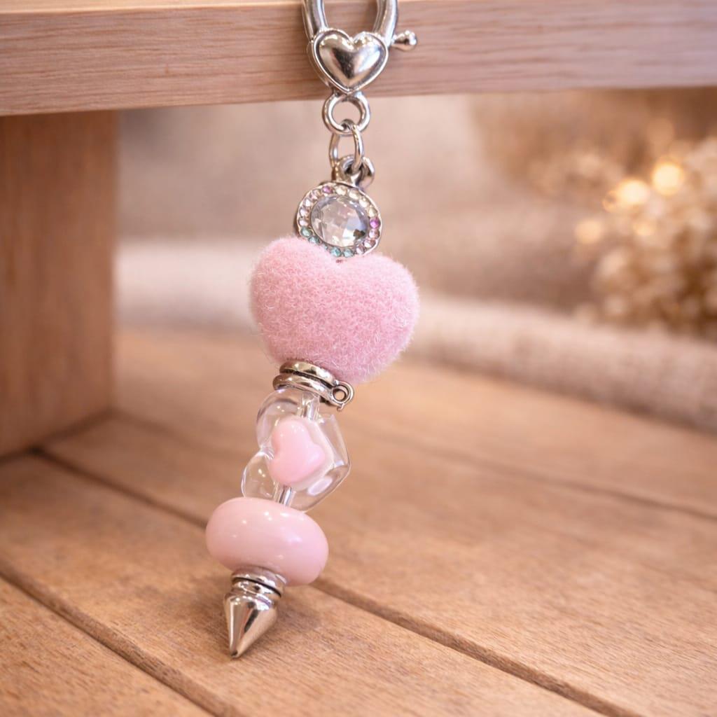 Juste en dessous, une perle crochetée dans un rose clair enveloppe l’ensemble d’une chaleur artisanale, douce et rassurante.