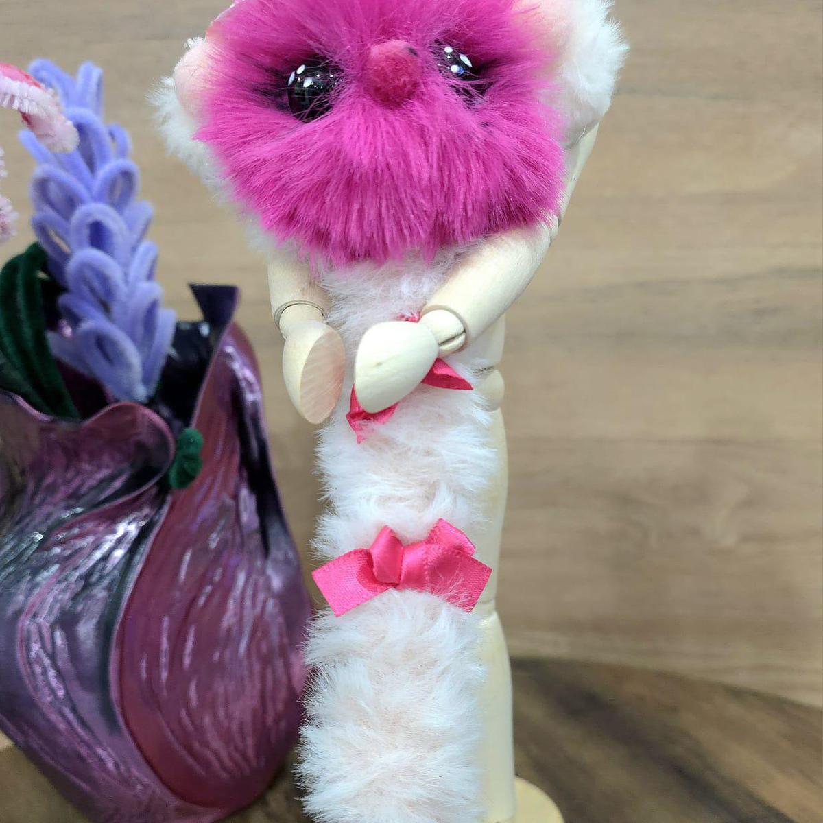 Au sommet, un pompon blanc accueille un petit personnage au visage rigolo et malicieux, aux yeux expressifs, délicatement décoré de rubans et de détails soigneusement assemblés.